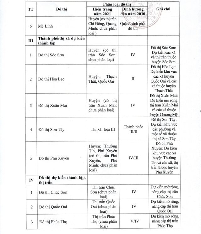 Bên cạnh đó, các thành phố/ thị xã dự kiến thành lập gồm: Đô thị Sóc Sơn, đô thị Hòa Lạc, đô thị Xuân Mai, đô thị Sơn Tây, đô thị Phú Xuyên.